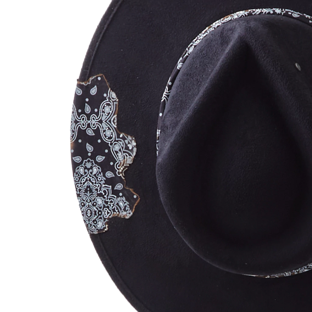O design do modelo Tupac é composto por uma banda estampada Paisley (bandana) ajustada em um nó de gravata na lateral. No lado oposto, um retalho queimado do mesmo tecido e rebites metálicas, adicionando textura e um ar de irreverência ao design.