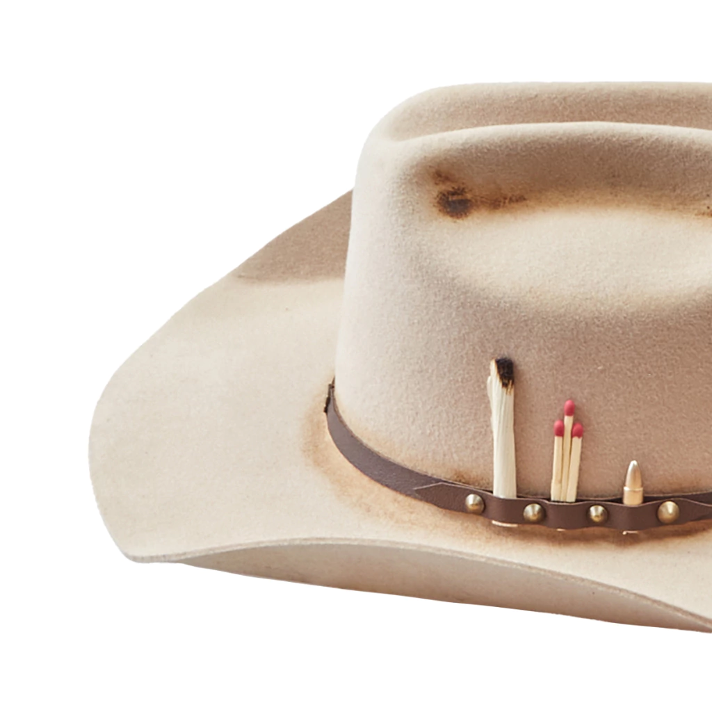 O design do modelo Estopim é composto por uma band de raspa de couro marrom, firmada como um cinturão de histórias que guardam apenas o essencial, cigarro de palha, fósforos, um cartucho de bala e cartas de carteado. Cada detalhe, queimado à mão por um pirógrafo, traz cicatrizes de jornadas passadas e promessas de aventuras futuras. Para selar o acabamento, o pin em ouro velho da Tualma, trazendo a tradição e identidade da marca.