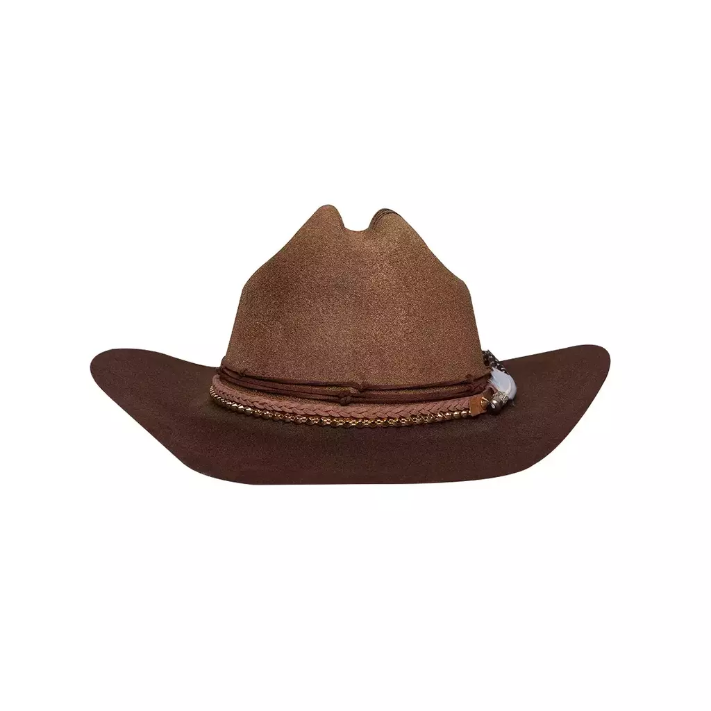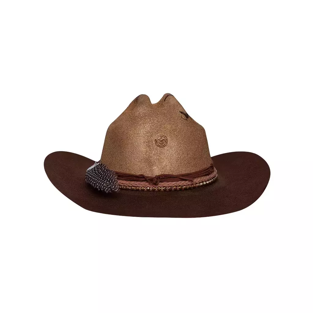 O design do modelo Janes&Jones é composto por algumas bands de camurça transada rosada, camurça marrom escuro com pequenos nós, uma corrente de cravos em outro velho, um detalhe lateral, uma cinta de raspa de couro com um conjunto de penas removíveis de galinha selvagem e ganço e a aba do chapéu pintada mais escura que a copa.