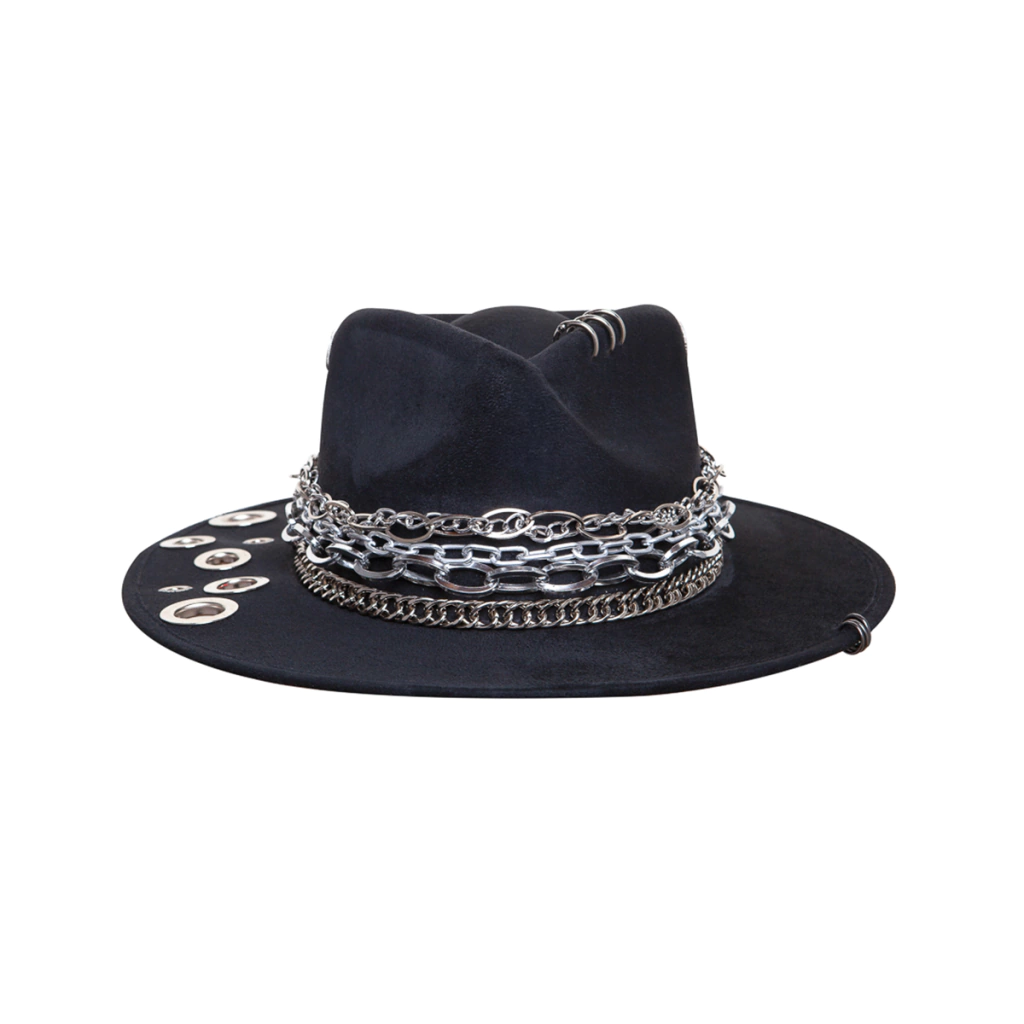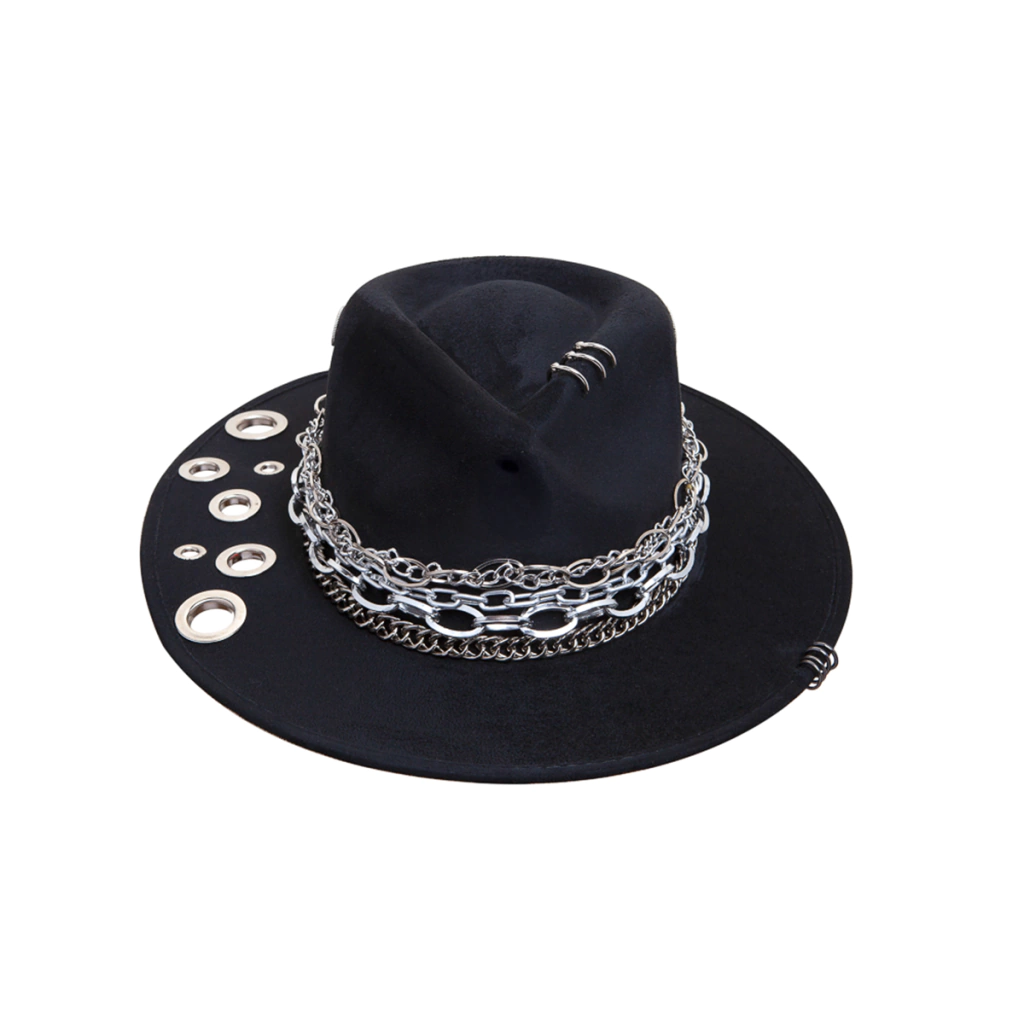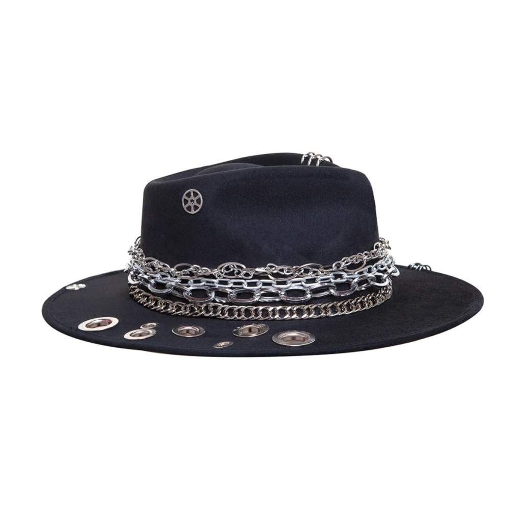 O design do modelo Full Metal Jacket é composto por um composê maximalista de várias correntes de diversos tamanhos em prata, argolas e ilhós perfurando a base, do chapéu, além de simbologias de paz e guerra como o cartucho de bala, e a engrenagem que juntas trazem o enrredo do filme Full Metal Jacket que leva o nome do produto.