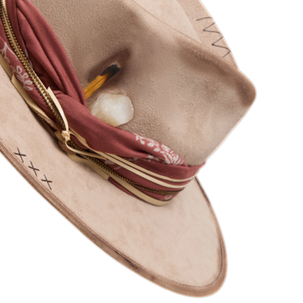 O design do modelo Palo é composto por uma band estampada Paisley (bandana) marrom escuro finalizada com um nó lateral segurando um palo santo queimado e uma pedra de citrino amarelo trazendo a ideia de uma fogueira, enquanto ficam entrelaçados por correntes em ouro velho, tira de camurça branco e cordão de palha sintética marfim, bordados em marrom, a frase “All you need is love” queimada com pirógrafo e com as beiradas queimadas dando um aspecto rústico vintage. O conjunto faz você lembrar que “Amor é chama que arde sem se ver” e para não se ver é preciso confiança e proteção para deixar arder em paixão.