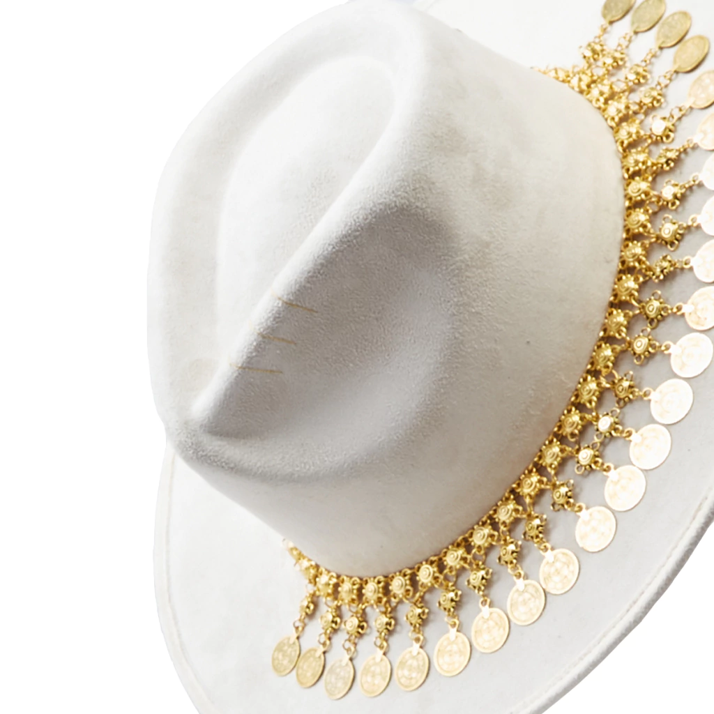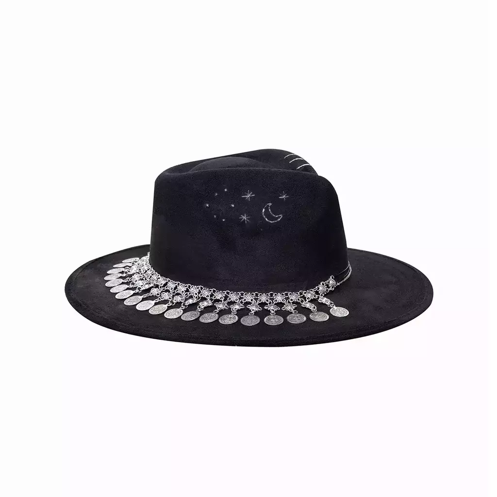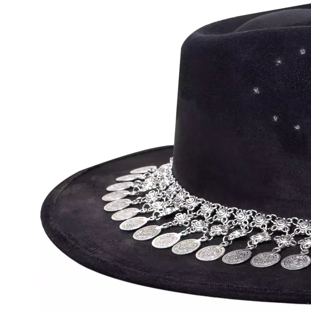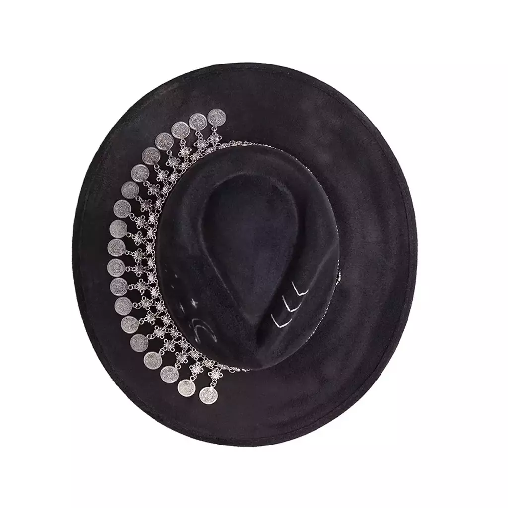 O design do modelo Shooting Star é composto por uma band/faixa externa em fina corrente de metal prata com moedas ciganas presas à aba do chapéu.
