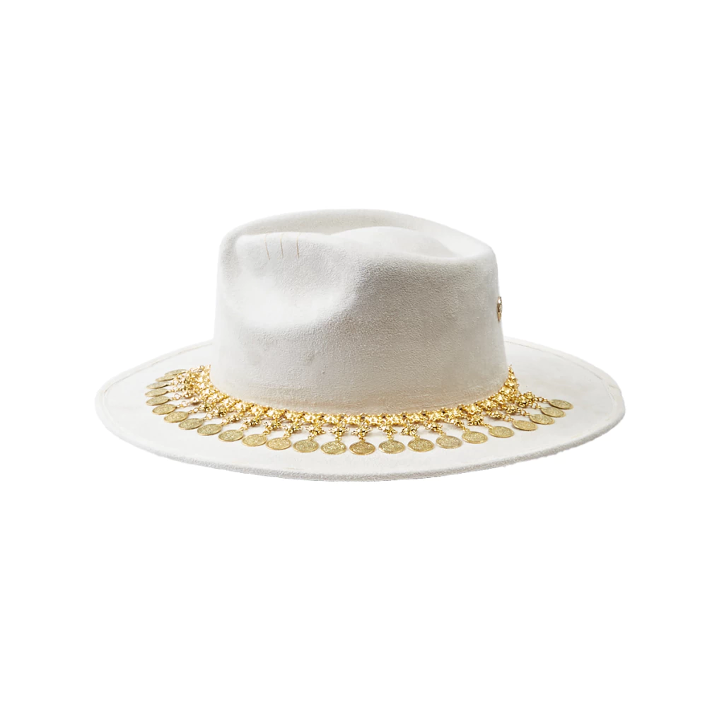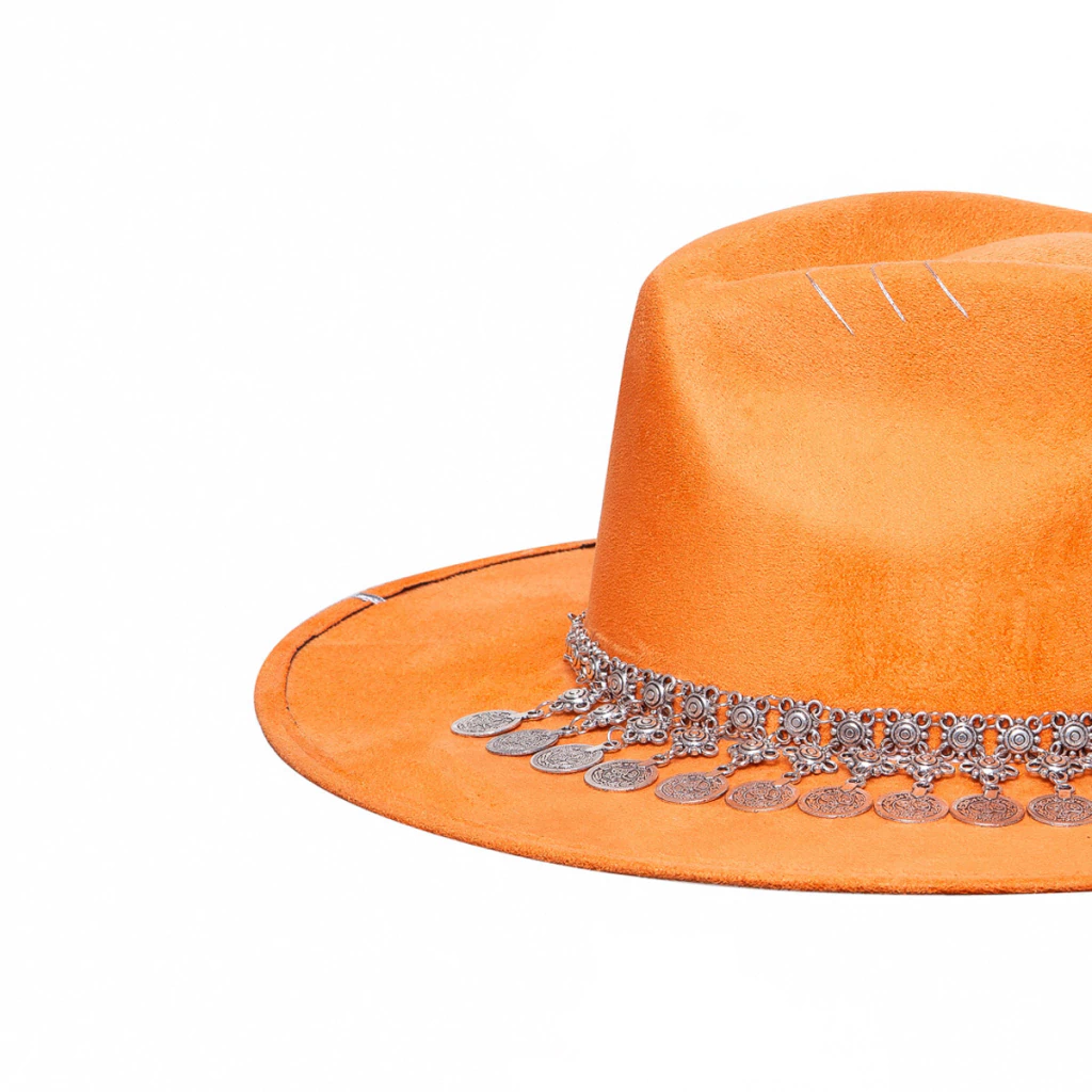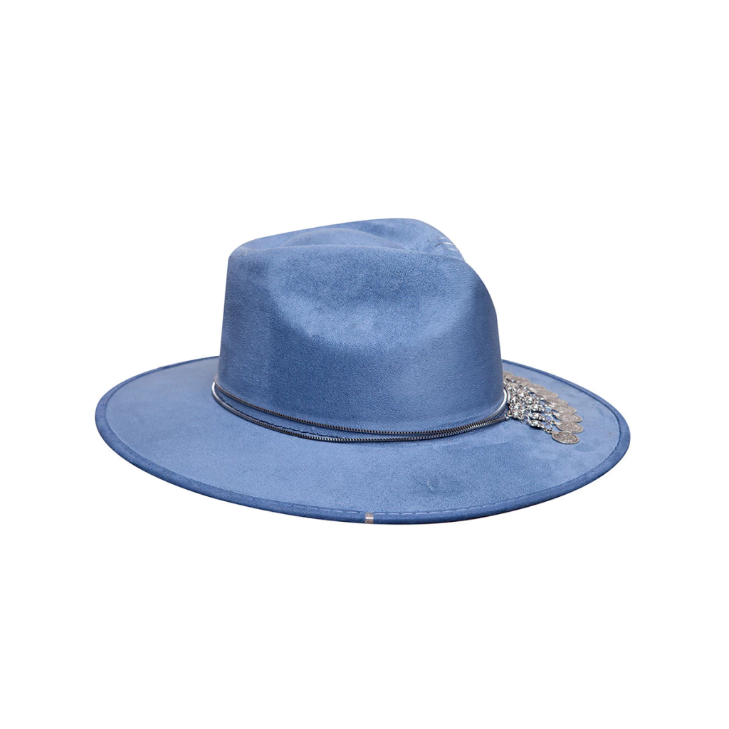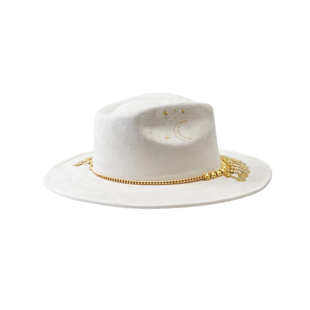 O design do modelo Shooting Star é composto por uma band/faixa externa em fina corrente de metal prata com moedas ciganas presas à aba do chapéu.