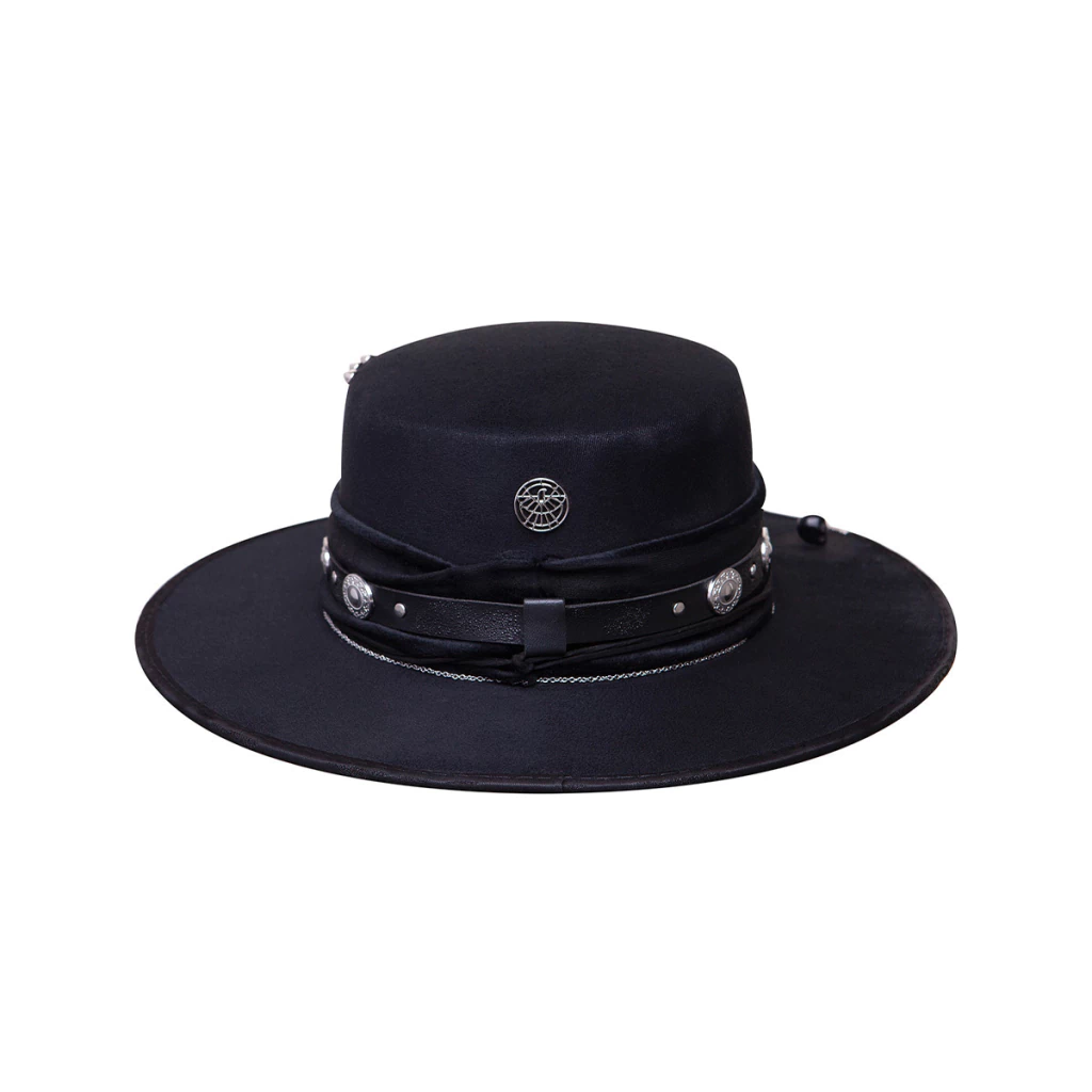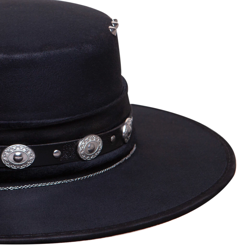 O design do modelo Texas Boater é composto por uma band de veludo preto, sobreposta por uma cinta de courino preto com conchos prata, abaixo uma corrente prata e presa na larga aba, uma caveira pequena também preta trazendo um ar irreverente e fashionista á peça.