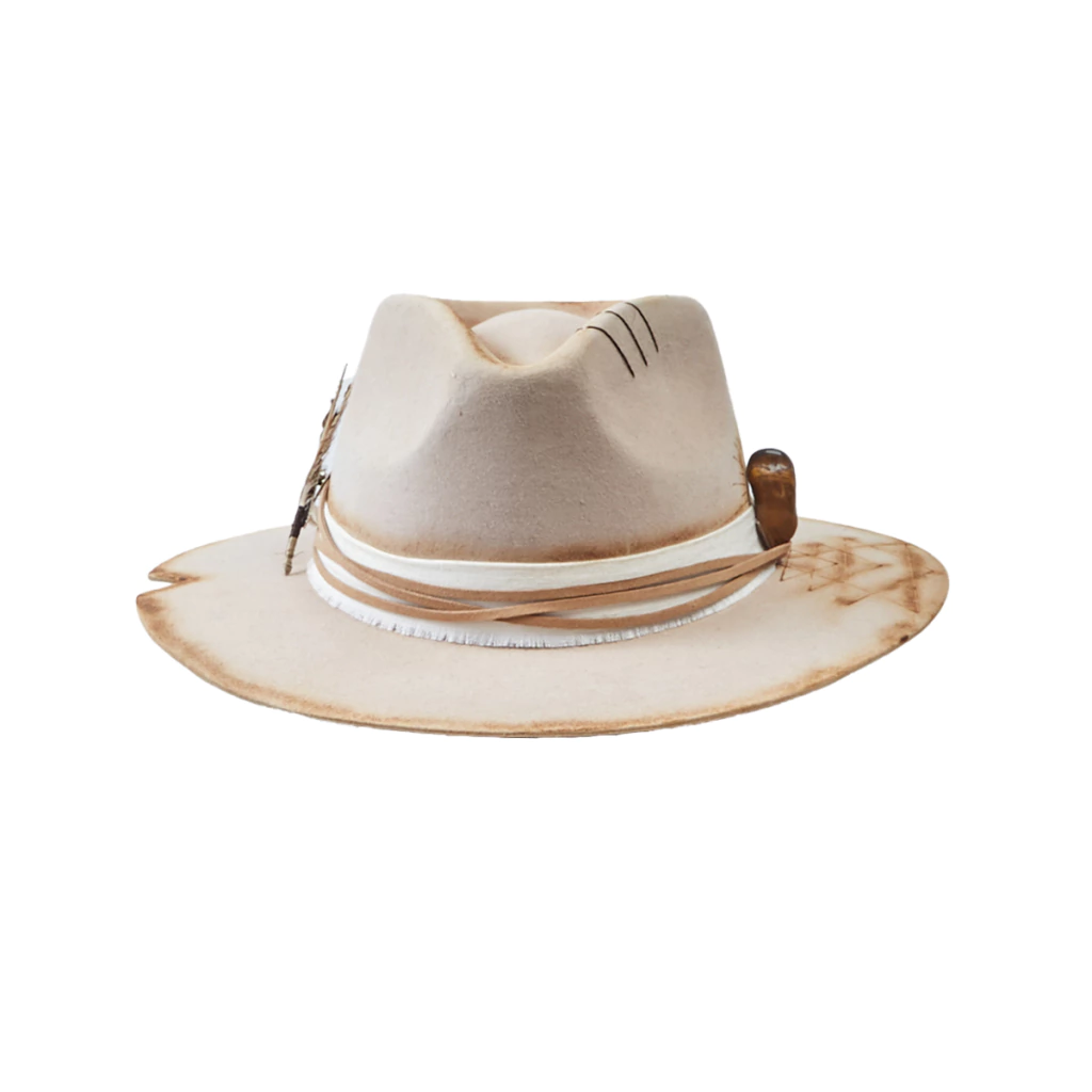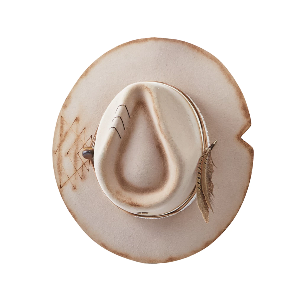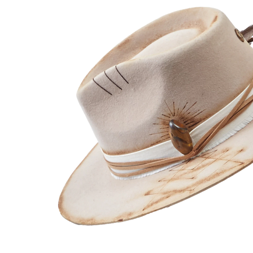 O design do modelo Valknut é composto por uma band/faixa externa em algodão branco, envolta por um fio bege de couro camurça que também prende de forma estilosa uma pequena pedra de Olho de Tigre posicionada na lateral esquerda do chapéu. Desse mesmo lado, um símbolo de origem Viking chamado Valknut representa o infinito.