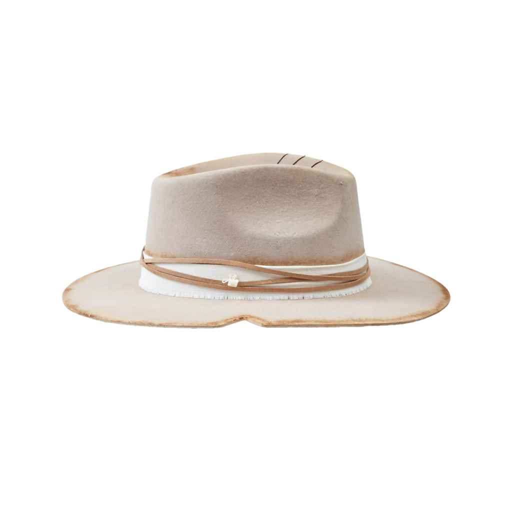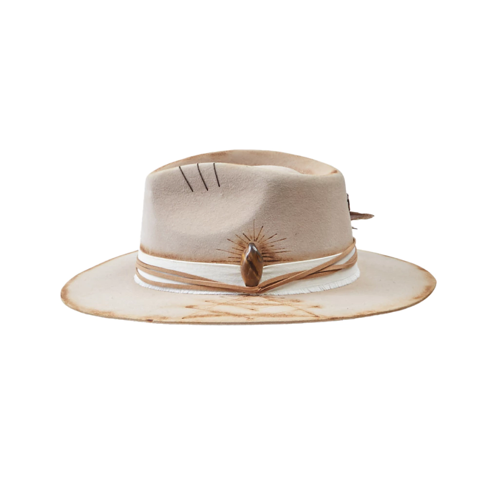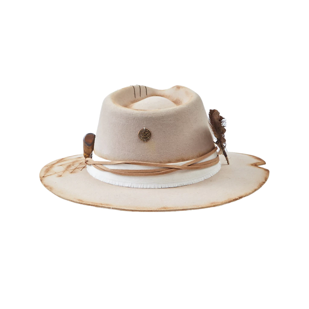 O design do modelo Valknut é composto por uma band/faixa externa em algodão branco, envolta por um fio bege de couro camurça que também prende de forma estilosa uma pequena pedra de Olho de Tigre posicionada na lateral esquerda do chapéu. Desse mesmo lado, um símbolo de origem Viking chamado Valknut representa o infinito.
