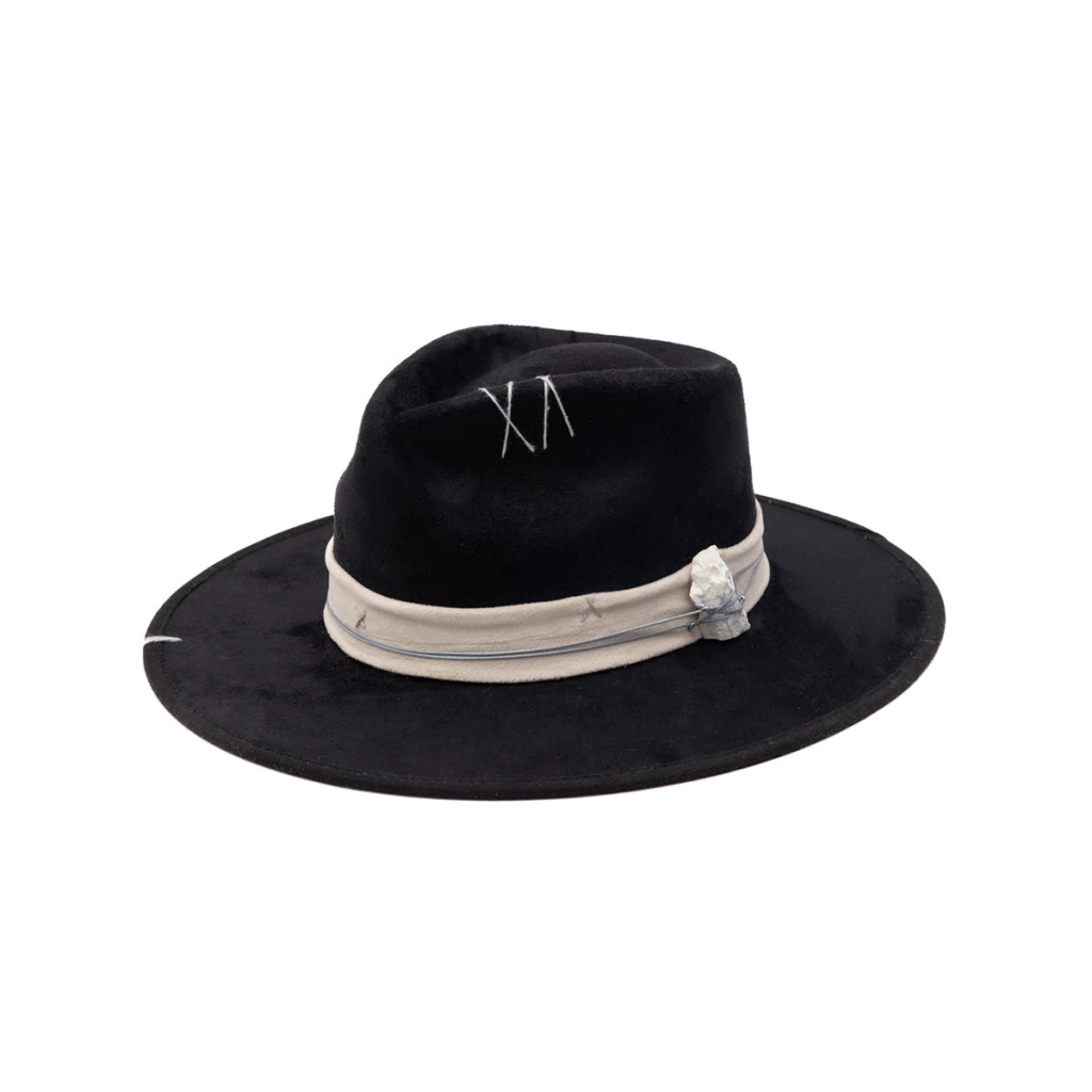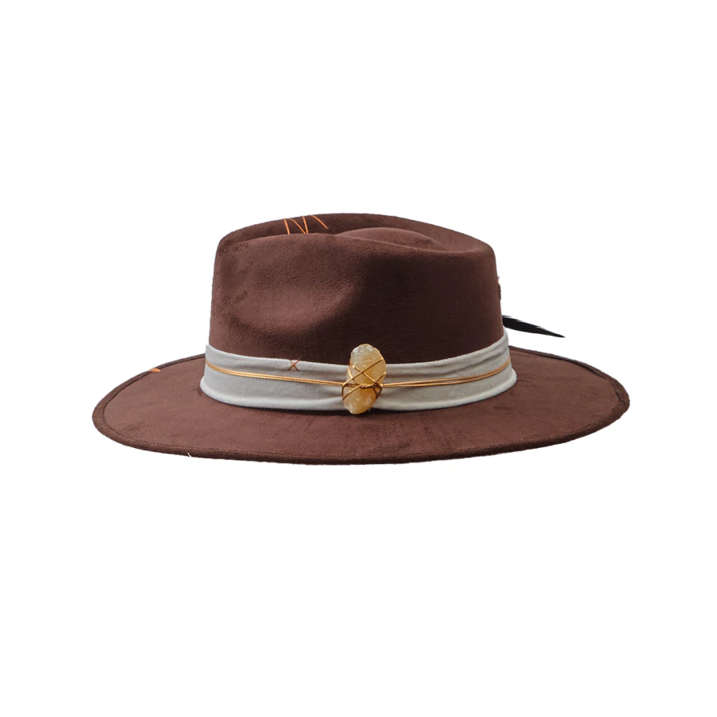 O design do modelo Velvet é composto por uma band externa em veludo marfim, envolta por um cordão dourado que também prende de forma estilosa uma pequena pedra de Calcita Amarela posicionada na lateral esquerda do chapéu transmitindo energia e vitalidade além de penas removíveis de faisão trazendo uma sutileza e movimento à peça.