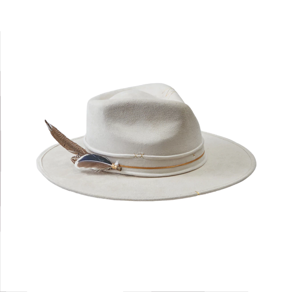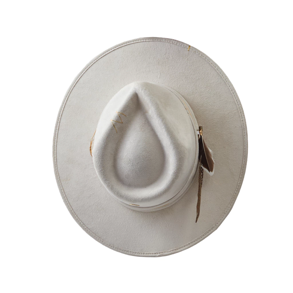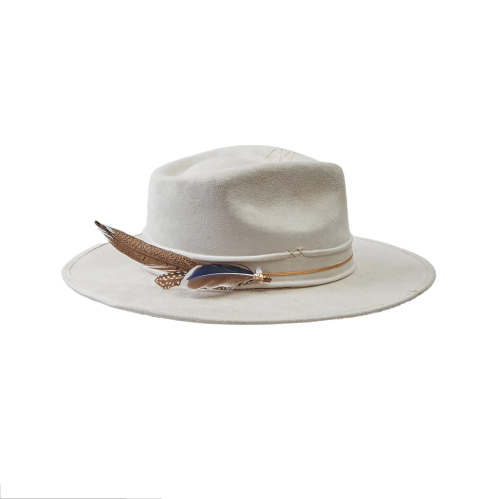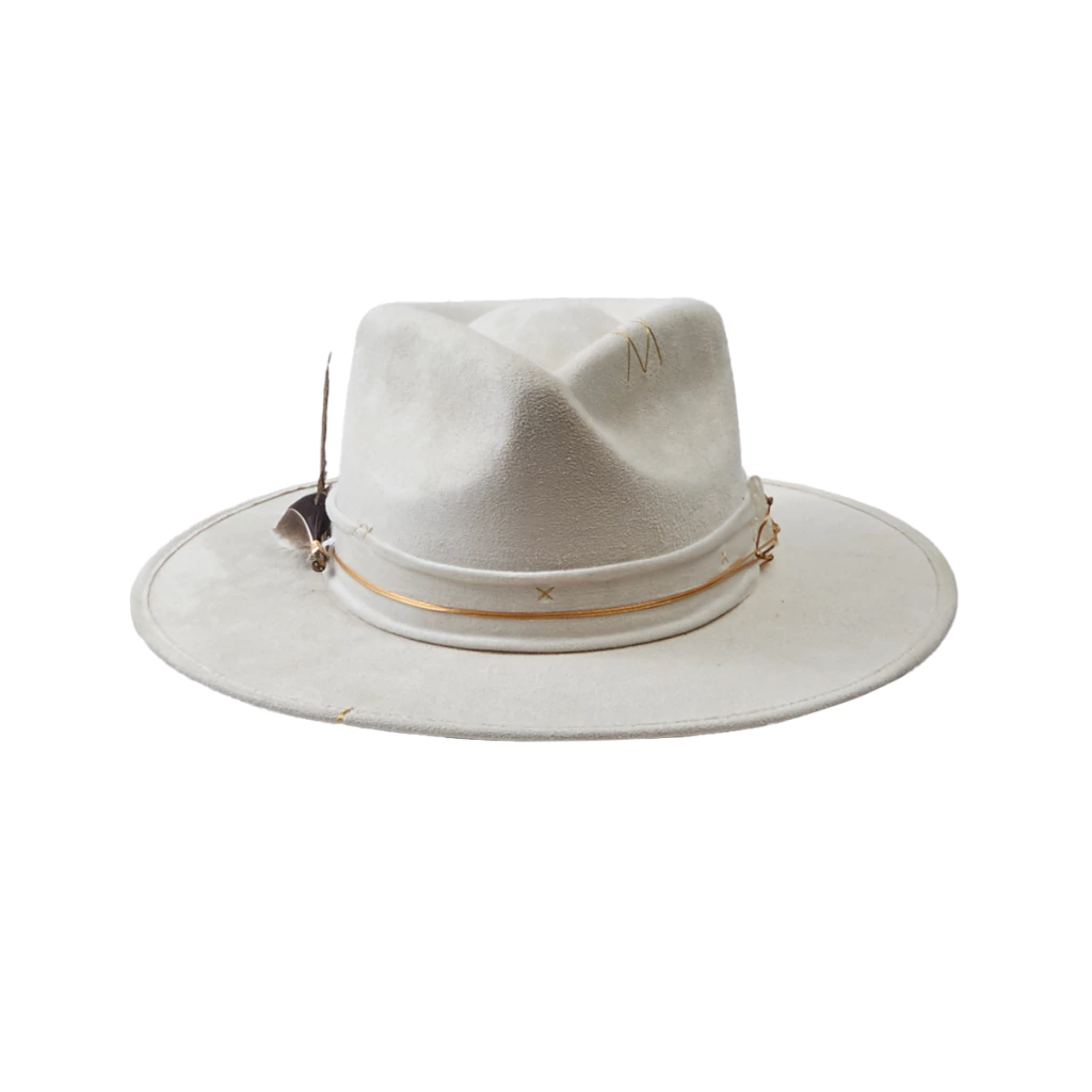 O design do modelo Velvet Nave é composto por uma band/faixa externa em veludo Branco, envolta por um fio branco de cetim que também prende de forma estilosa uma pequena pedra de Quartzo branco posicionada na lateral esquerda do chapéu. Do lado direito, um jogo de 2 penas que pode ser removido e recolocado conforme a ocasião do uso da peça.