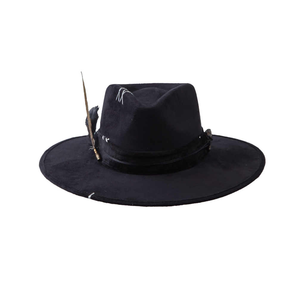 • O design do modelo Velvet é composto por uma band externa em veludo preto, envolta por um cordão branco que também prende de forma estilosa uma pequena pedra de Calcita Amarela posicionada na lateral esquerda do chapéu transmitindo energia e vitalidade além de penas removíveis de faisão trazendo uma sutileza e movimento à peça.